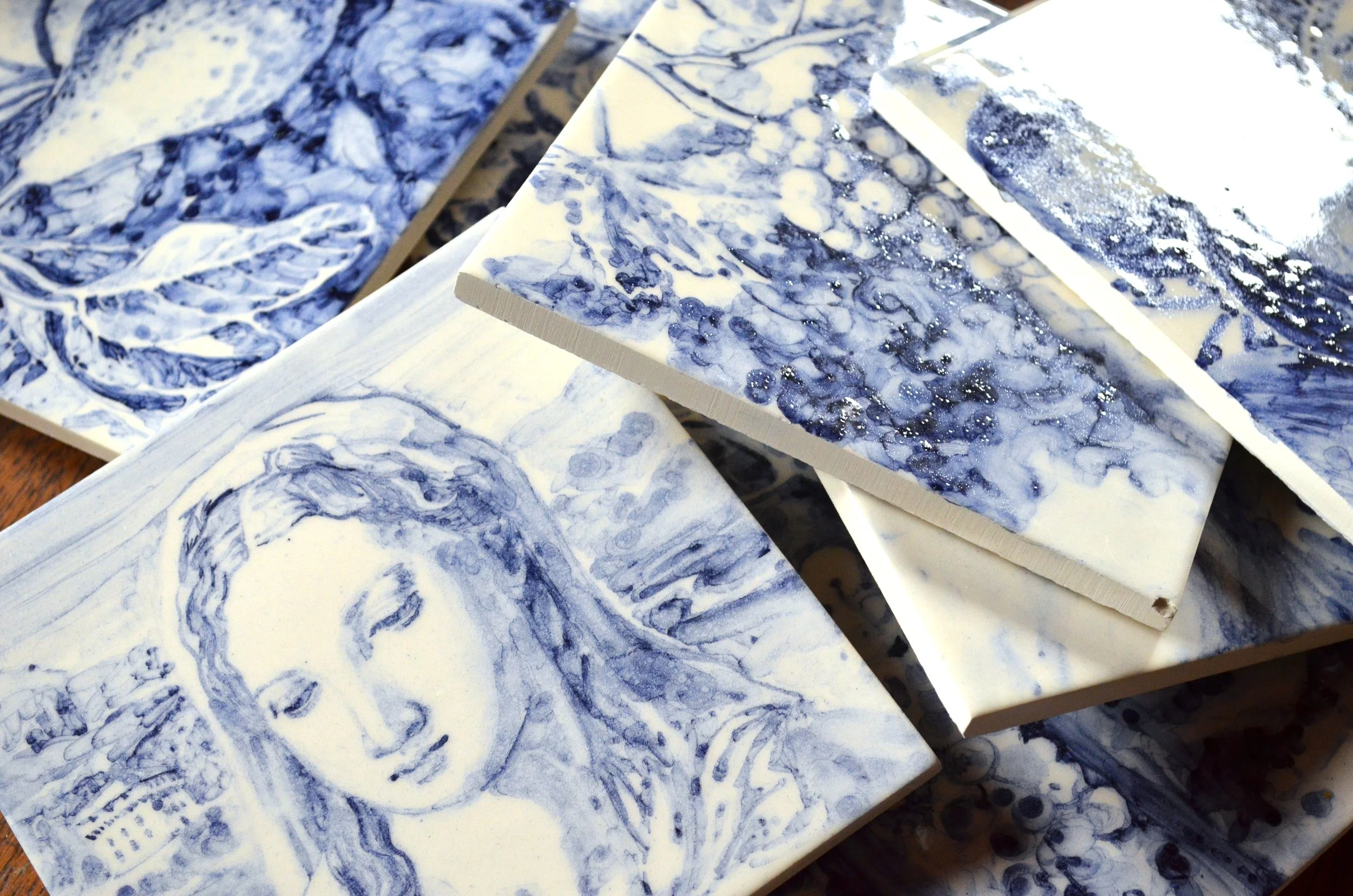Chaque carreau est peint à la main. L’oxyde de cobalt, de couleur noire, devient bleu à la cuisson à haute température, selon un procédé utilisé depuis des siècles comme pour les azulejos ou les carreaux de Delft.